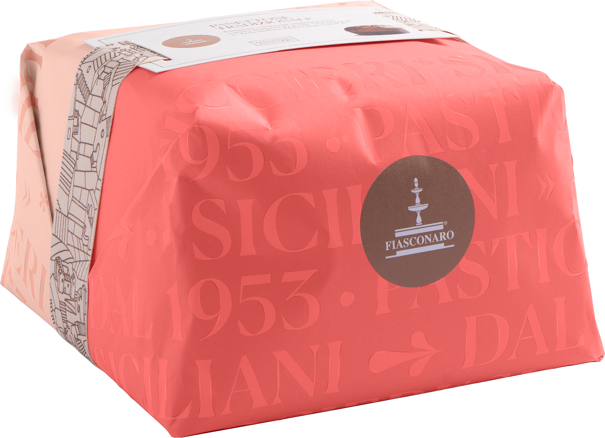 Panettone Fiasconaro Tradizionale da 1 kg con canditi d’arancia e uvetta aromatizzato al vino Marsala DOC e Zibibbo liquoroso.